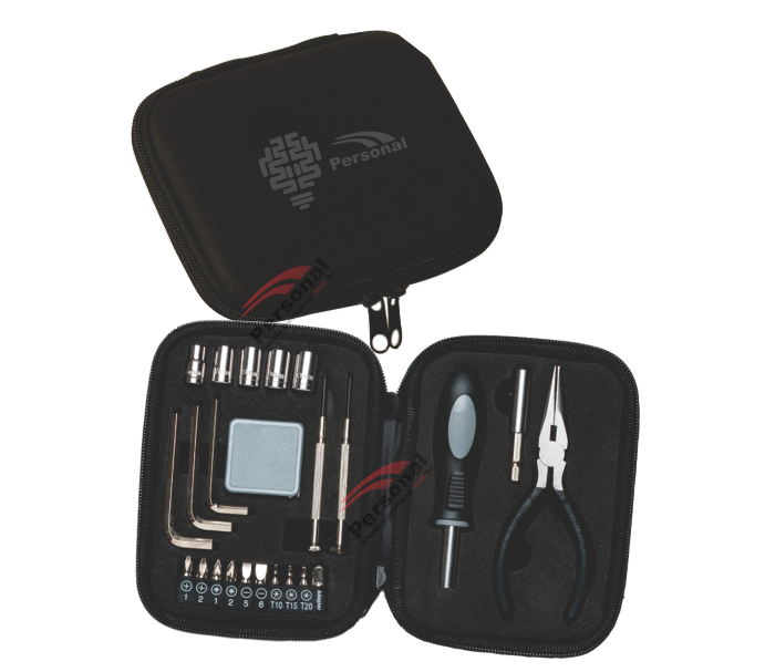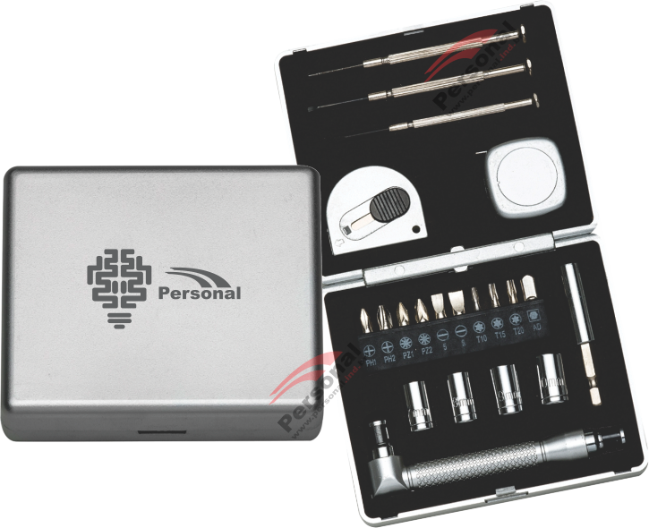Kit ferramenta 24 peças em estojo de couro sintético. Possui: 5 extensores bocais(6MM, 7MM, 8MM, 9MM e 10MM), 3 tamanhos de chave Allen, trena de 1 metro(sem trava), 1 chave Philips, 1 chave Fenda, conjunto 10 pontas(4 chaves phillips, 2 chaves fenda, 3 chaves torx e um adaptador), chave auxiliar, chave que alonga ferramenta e alicate. Estojo de couro sintético com zíper e parte interna revestida de espuma.